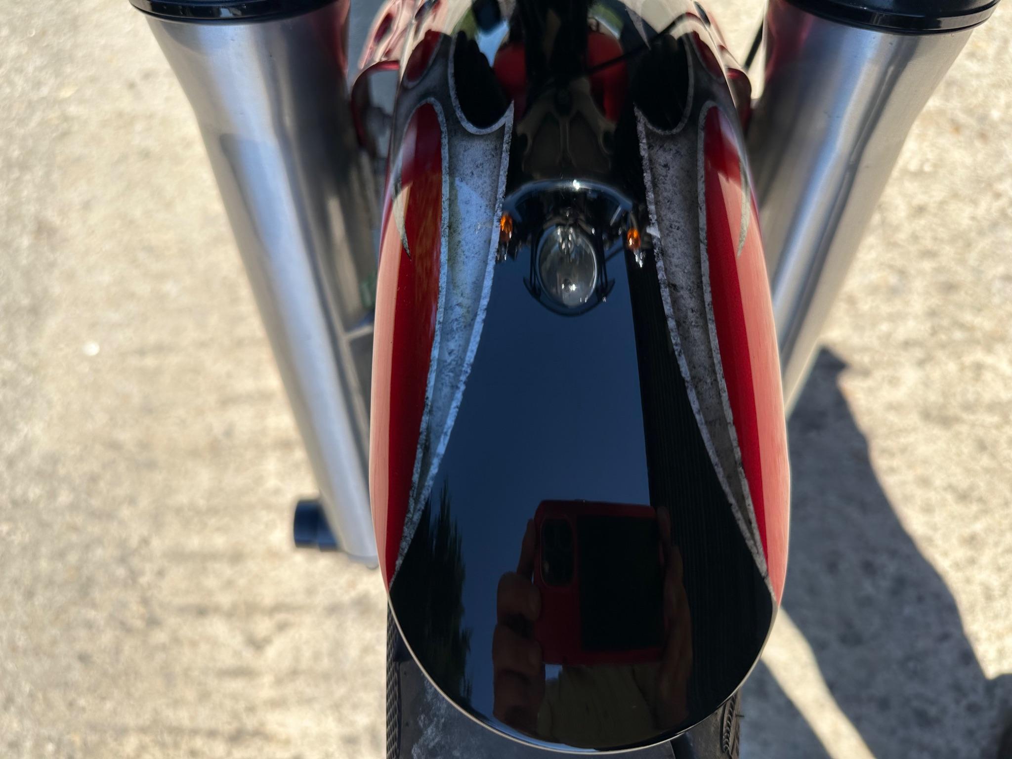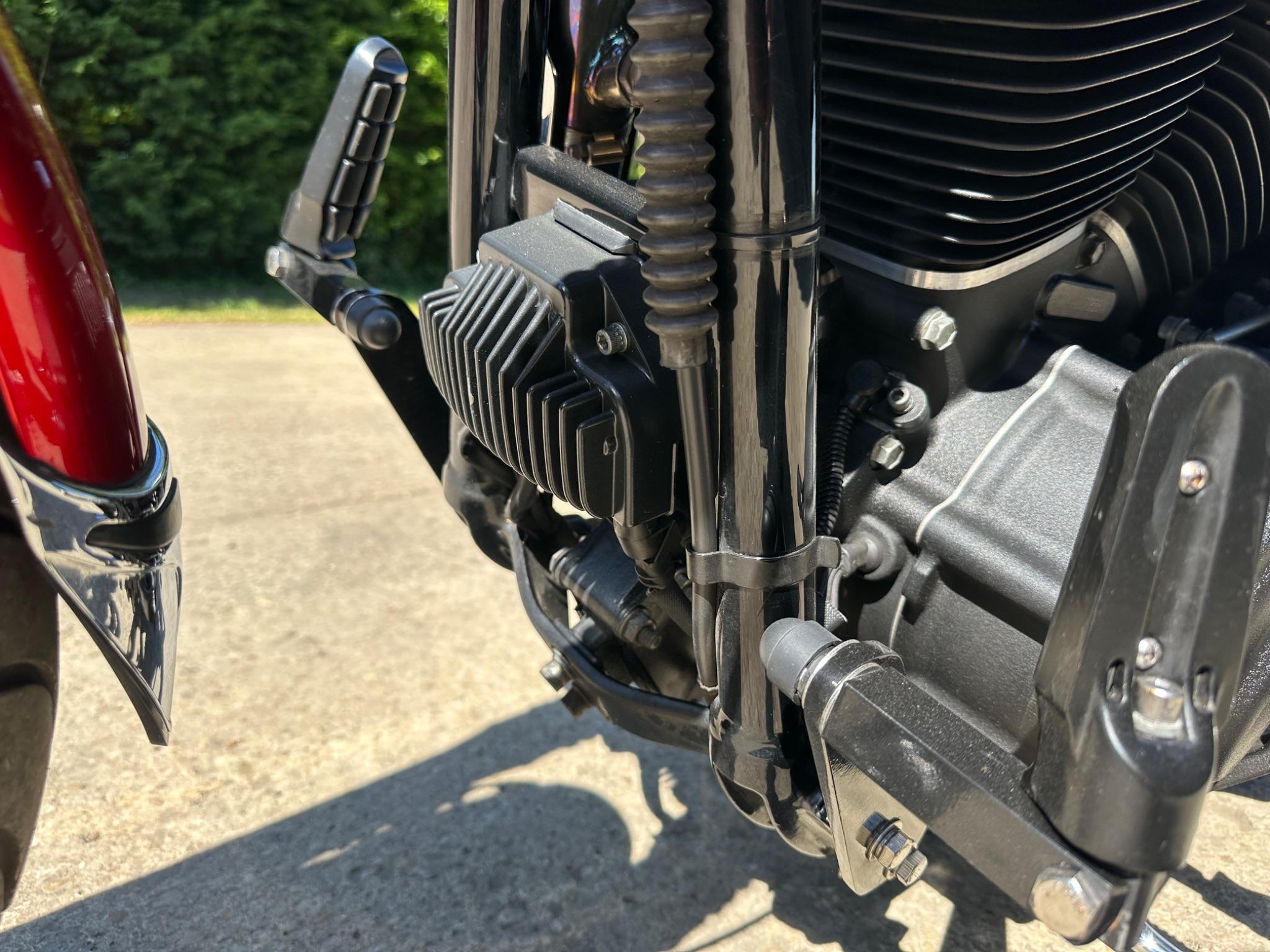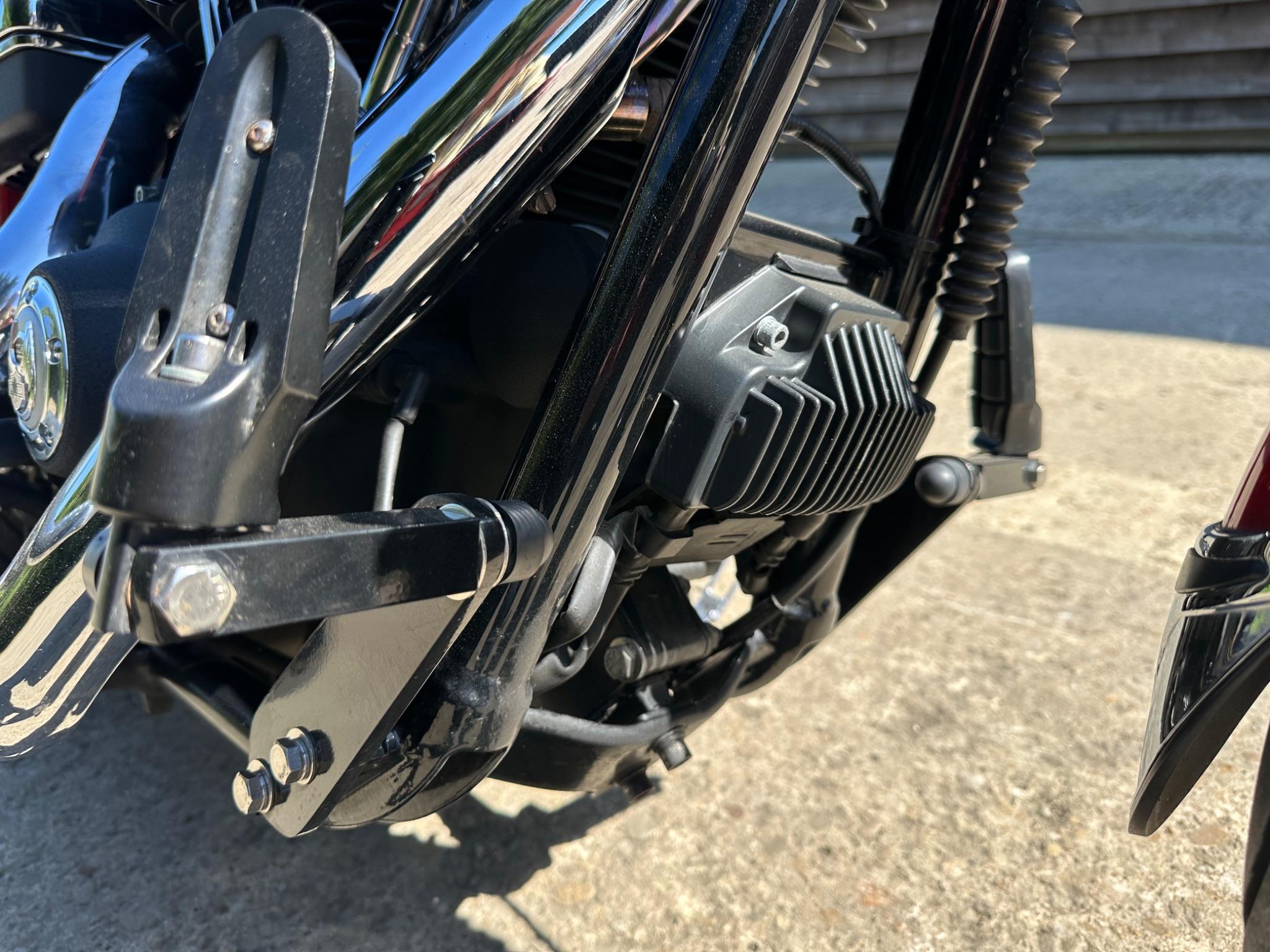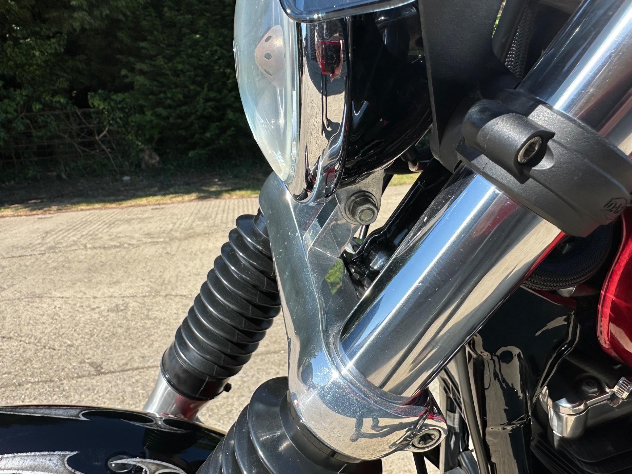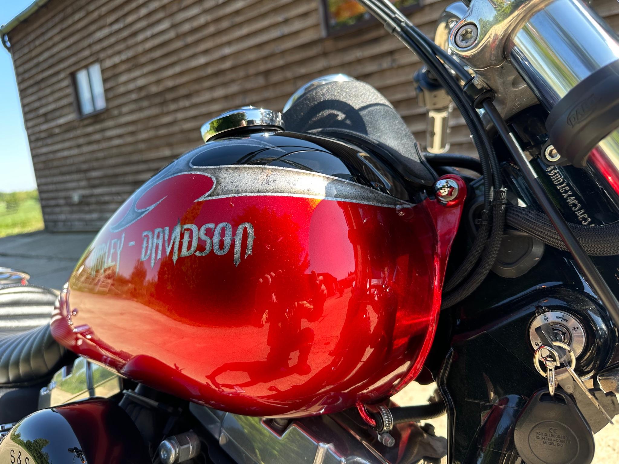 Here is a custom painted Harley Davidson Street Bob in black , red , silver. The paintwork is exquisite! The bike has its original owners/service book and two keys and fobs. The bike has had 12 services done by dealers/specialists and has only just been serviced at 8401 miles in March 2025! The bike has a host of extras and these include a stage one with V&H chrome radius pipes , S&S filter , Screamin Eagle plug leads , fly screen , highway pegs , chrome rack , fork protectors , fork gaiters , black chain guard , Harley cushion grips , black horn cover , Le Pera custom seat and a mega custom paint job!
